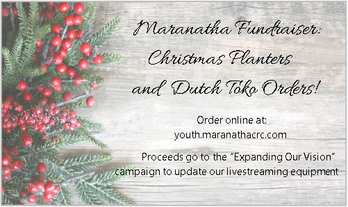 Our youth are so excited to offer their annual fundraiser, this year to put towards our “Expanding Our Vision” campaign to update our livestreaming equipment here at Maranatha! Check out youth.maranathacrc.com for all the goodies, including gorgeous Christmas planters and delicious treats from Dutch Toko. This fundraiser will close at 4pm on November 20. Planters will be ready on November 27 and 28. Please note that we will also have contactless pick up at the church for all the rest of the goodies and you will be notified by email when those dates will be. Please let us know if you have any questions. Thank you!